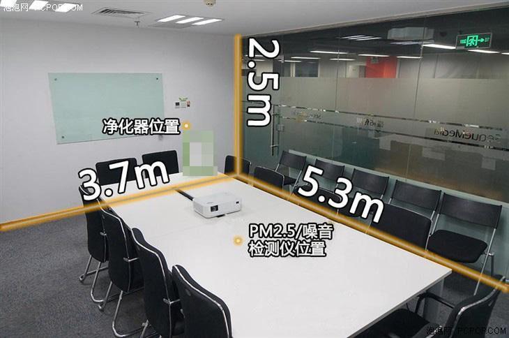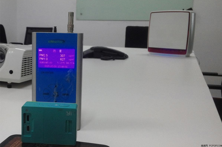 測試環(huán)境為關(guān)閉空調(diào)和門窗的會議室,會議室面積大概為19.6平方米,層高2.5米,容積約等于49立方米。通過抽煙“造霾”,最終室內(nèi)PM2.5顆粒物濃度控制在402微克/立方米(國家空氣質(zhì)量標(biāo)準(zhǔn)中250微克/立方米即為嚴(yán)重污染),同時,所有測試人員在測試環(huán)境內(nèi)佩戴口罩以減少人為PM2.5消耗。