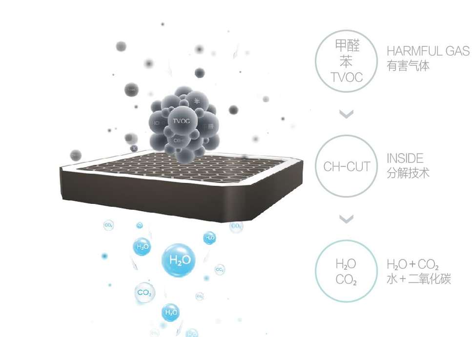 簡(jiǎn)單地說(shuō),CH-CUT的原理在于利用納米級(jí)功能性催化劑材料的催化作用,在室溫下對(duì)甲醛、苯類等TVOC有機(jī)污染物進(jìn)行高效分解。在凈化過(guò)程中,俗稱“碳?xì)浼舻丁钡腃H-CUT技術(shù)促使有機(jī)物中的碳?xì)滏湐嗔眩箍諝庵械难醴肿优c斷裂的碳?xì)滏湴l(fā)生化學(xué)反應(yīng),進(jìn)而生成二氧化碳和水。