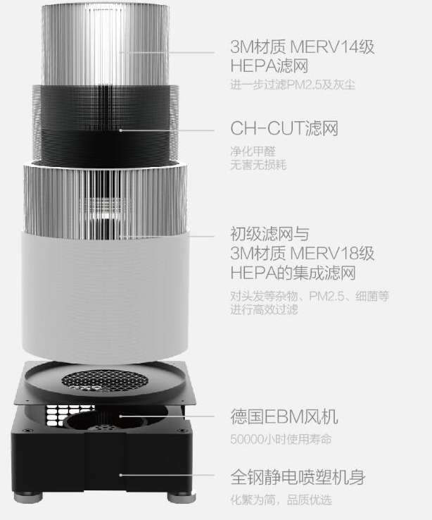 T30S高效的凈化效果源于獨(dú)創(chuàng)的雙層高密度HEPA濾網(wǎng)結(jié)構(gòu)與CH-CUT第四代凈化技術(shù)。開機(jī)后,初級(jí)濾網(wǎng)與3M材質(zhì)MERV 18級(jí)HEPA網(wǎng)的集成濾網(wǎng)首先對(duì)污染氣體進(jìn)行微米級(jí)篩分和納米級(jí)過(guò)濾,毛發(fā)、飛絮、PM2.5、細(xì)菌等顆粒物得到濾除,HEPA濾網(wǎng)對(duì)直徑大于等于0.28微米細(xì)顆粒(包括灰塵、煙霧、花粉、霉菌孢子等過(guò)敏原和細(xì)菌)的去除率更是高于99%。之后,UCHEER專利CH-CUT濾網(wǎng),對(duì)空氣中甲醛、苯類等TVOC有害氣體進(jìn)行高效分解。