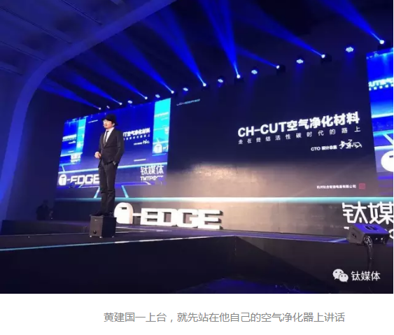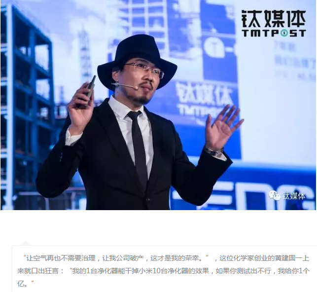 在演講中,黃建國表示愿意將自己開發的空氣凈化產品(UCHEER友好甲醛凈化器系列產品)與小米旗下的產品來一次性能的“對賭”,并且是“以一敵十”的較量。